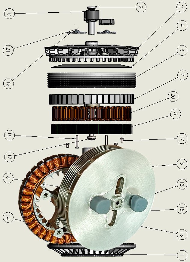 • Магнитная система ротора: тип постоянных магнитов (NdFeB, SmCo), их геометрия, количество полюсов, способ крепления на